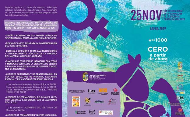 El Ayuntamiento de Zafra, a través de la Concejalía de Bienestar Social e Igualdad, ha organizado un amplio programa de actividades conmemorativas del 25 N, Día Internacional de la Eliminación de la Violencia contra las Mujeres. Una jornada reivindicativa para la que el Instituto de la Mujer de Extremadura (IMEX) ha elegido este año el lema: 'Más de 1.000… Cero a partir de ahora', al que se suma el Consistorio zafrense. La concejala Mayca Cabello dijo que «las cifras de mujeres asesinadas siguen dando escalofríos, nos sentimos impotentes porque trabajamos en igualdad, concienciando y sensibilizando, pero queda mucho para erradicar la violencia de género».