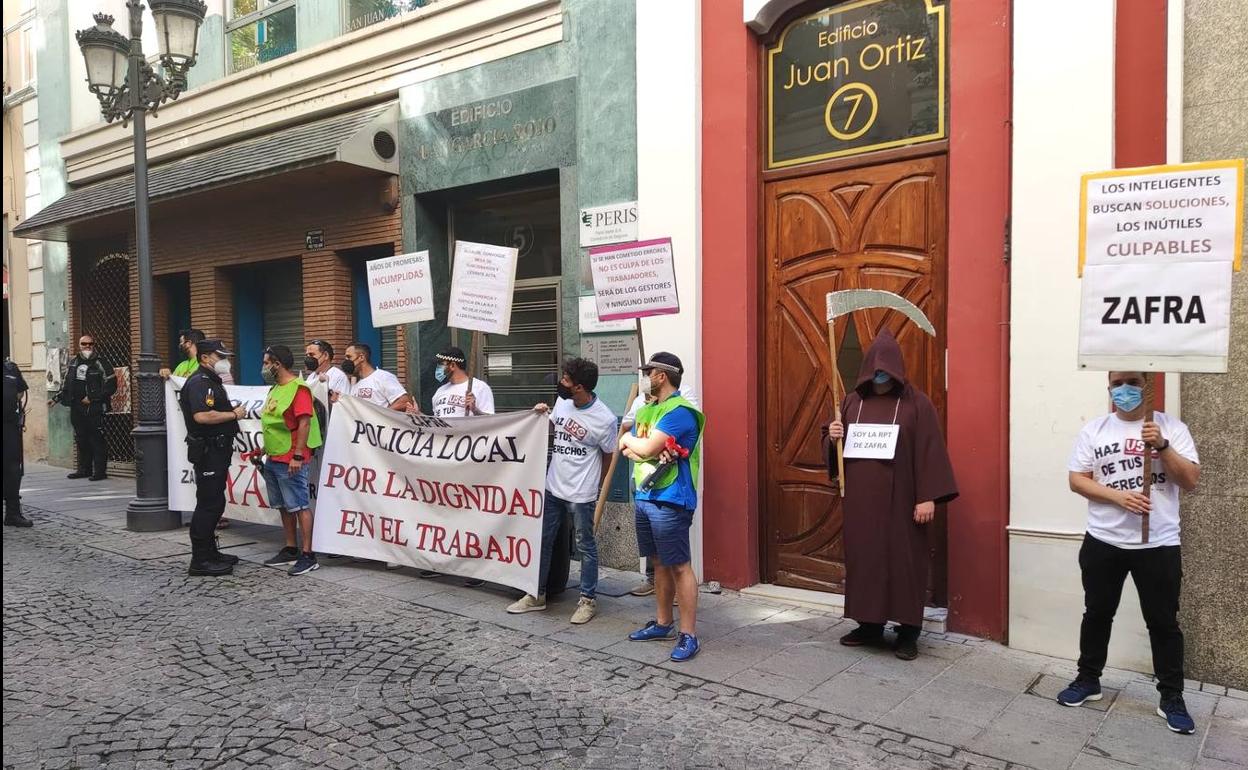 El sindicato USO, al que están afiliados muchos de los policías locales de Zafra, realizó este martes 29 de junio, por la mañana, una concentración, ... según indican en representación de los trabajadores municipales de Zafra, a las puertas de la Diputación de Badajoz, lugar elegido para el acto por ser también el alcalde de Zafra, José Carlos Contreras, diputado de Economía y Hacienda. A él querían «recordarle» que «sigue teniendo una cuenta pendiente en su Ayuntamiento con todos los trabajadores municipales», como se indicó en el manifiesto que leyeron.