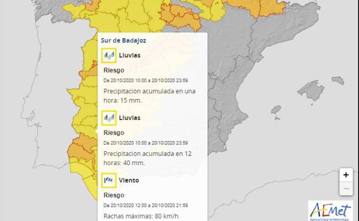 La Agencia Estatal de Meteorología (AEMET) ha informado que desde las 18.00 horas de este martes 20 de octubre, y hasta las 23.59 ... horas del miércoles 21, estaremos en alerta amarilla por rachas de vientos que pueden alcanzar los 80 km/h de componente sur, y pide a los ciudadanos que extremen las precauciones.