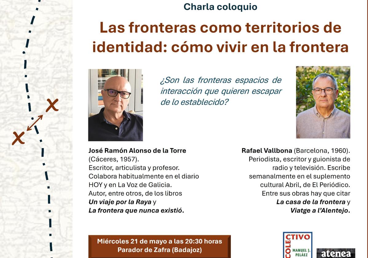 ¿Son las fronteras espacios de interacción en los que sus habitantes quieren escapar de los límites establecidos políticamente? Esta es la pregunta y el tema en torno al que charlarán, el próximo miércoles, 21 de mayo, a las 20.30 horas, en el Parador de Turismo de Zafra, los escritores José Ramón Alonso de la Torre y Rafael Vallbona.
