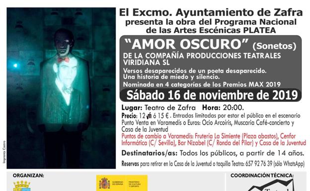 La obra cuenta con cuatro candidaturas a los Premios Max 2019 y será representada por la compañía aragonesa Viridiana ProduccionesLa obra 'Amor oscuro', de la compañía aragonesa Viridiana Producciones, llega al Teatro de Zafra el próximo 16 de noviembre a las 20.00 horas. El espectáculo, escrito y dirigido por Jesús Arbués, está dedicado a Federico García Lorca, ya que trata sobre los versos desaparecidos de un poeta desaparecido, una historia de miedo y silencio. Cuenta con cuatro candidaturas a los Premios Max 2019.