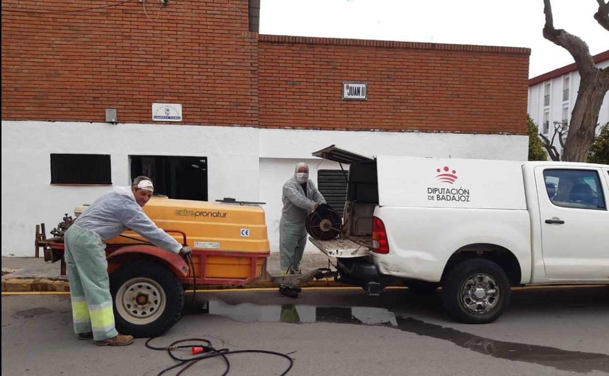 A estos trabajos realizados por los trabajadores municipales desde que comenzara esta crisis, se ha sumado durante el jueves 2 y el viernes 3 de abril un equipo especializado de Diputación de Badajoz.