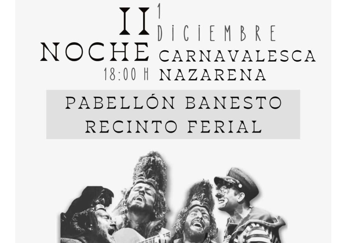Este domingo, 1 de diciembre, a las 18 horas, se celebrará la segunda edición del Festival Noche Carnavalesca Nazarena, un evento organizado por la Banda de Cornetas y Tambores 'Nazareno y Esperanza' con la colaboración del Ayuntamiento de Zafra.
