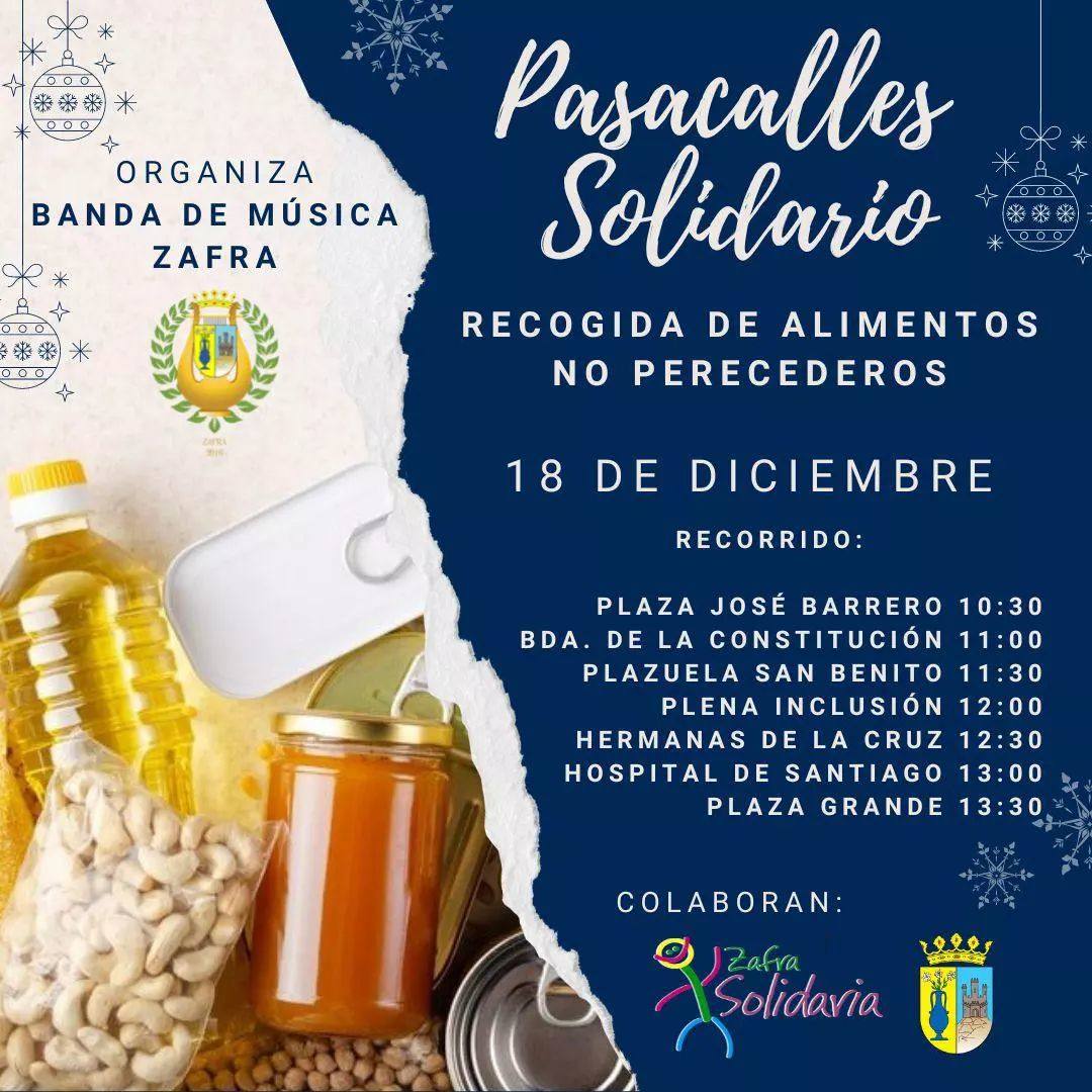 La Banda Municipal de Música de Zafra va a llevar a cabo un pasacalles solidario de recogida de alimentos no perecederos este próximo domingo 18 ... de diciembre, en colaboración con la Asociación Zafra Solidaria y el Ayuntamiento de Zafra.