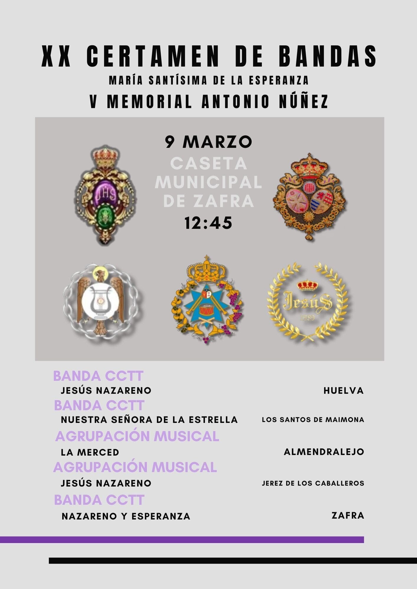 La Banda de Cornetas y Tambores de Nuestro Padre Jesús Nazareno y María Santísima de la Esperanza celebrará su XX Certamen de Bandas 'María Santísima de la Esperanza. V Memorial Antonio Núñez' el sábado 9 de marzo, a partir de las 12.45 horas, en la Caseta Municipal del recinto ferial.