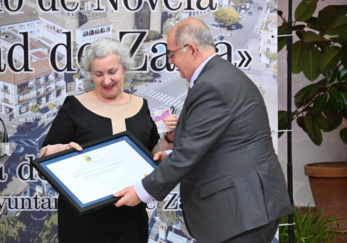 Fue el alcalde de Zafra el encargado de hacer entrega del premio a la escritora, Beatriz Carrero-Blanco Velázquez, que, durante su intervención, reconoció, contenta y agradecida, su sorpresa por ganar este premio que considera «un regalo». Explicó cómo fue dando forma a esta novela negra, 'Ojales de luz cautiva', y dedicó el galardón a su marido.