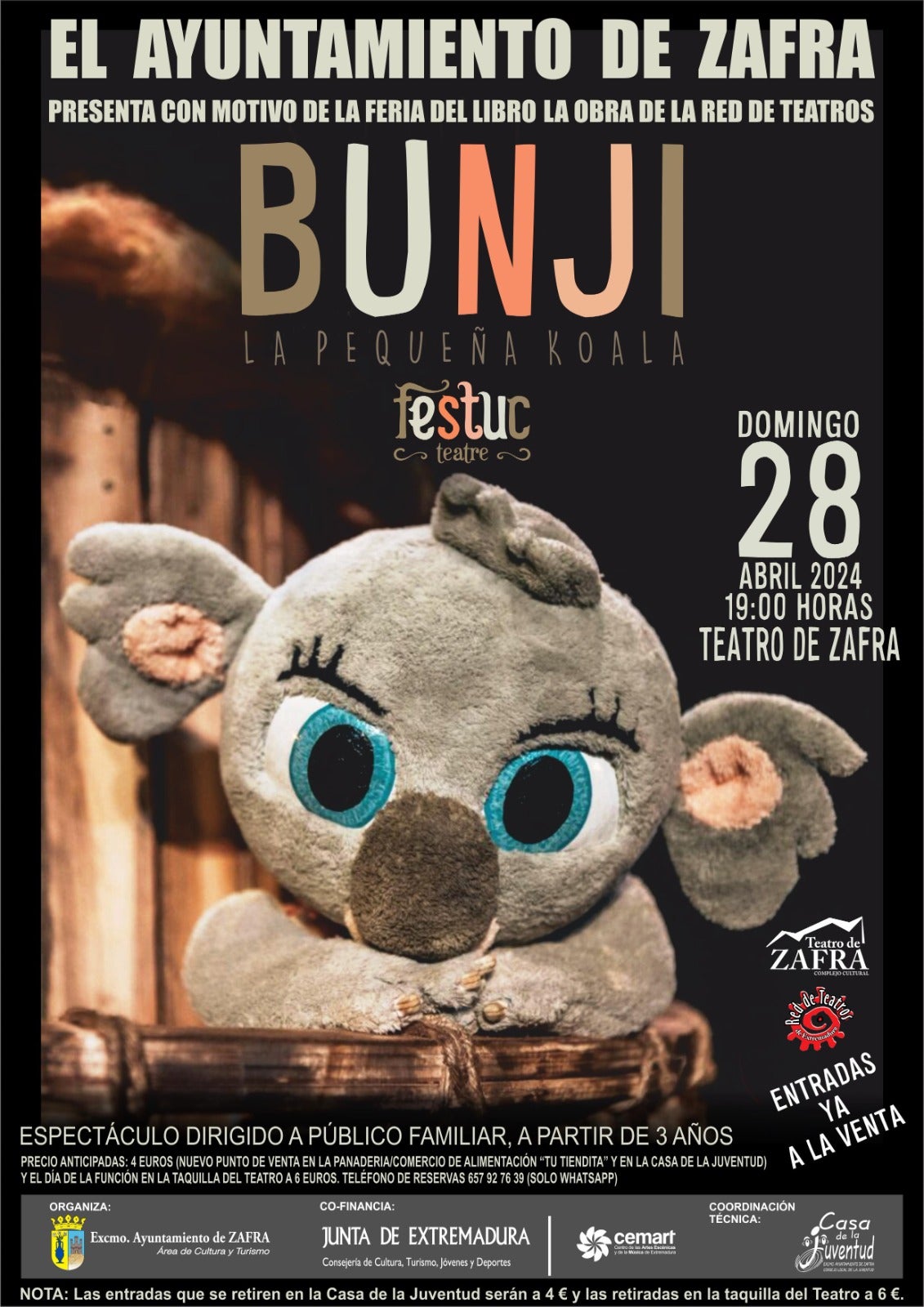 El Ayuntamiento de Zafra, a través de su Área de Cultura y Turismo, trae al Teatro de Zafra para el público familiar 'Bunji, la pequeña Koala', a cargo de la Compañía Festuc Teatre. Será el domingo día 28 de abril a las 19.00 horas.