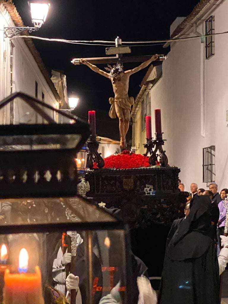 Sobre las 00.30 horas y con los últimos sones de fondo de la recogida del Nazareno y la Esperanza, las puertas del templo se abrieron para la salida del cortejo procesional. Túnicas negras, farolillos, cruces, cadenas y algunos nazarenos descalzos en señal de penitencia, salían a la calle ante el silencio y la solemnidad de los asistentes, sólo roto algunas veces por pequeñas toses, susurros, los pequeños toques de los bastones de mando de los diputados de tramo para que avanzara o se detuviera el cortejo, los más pequeños asombrados que preguntaban ante la curiosidad de lo que estaban viendo, el golpe seco del nuevo llamador del paso y el 'rachear' del cuerpo de costaleros por el adoquinado.