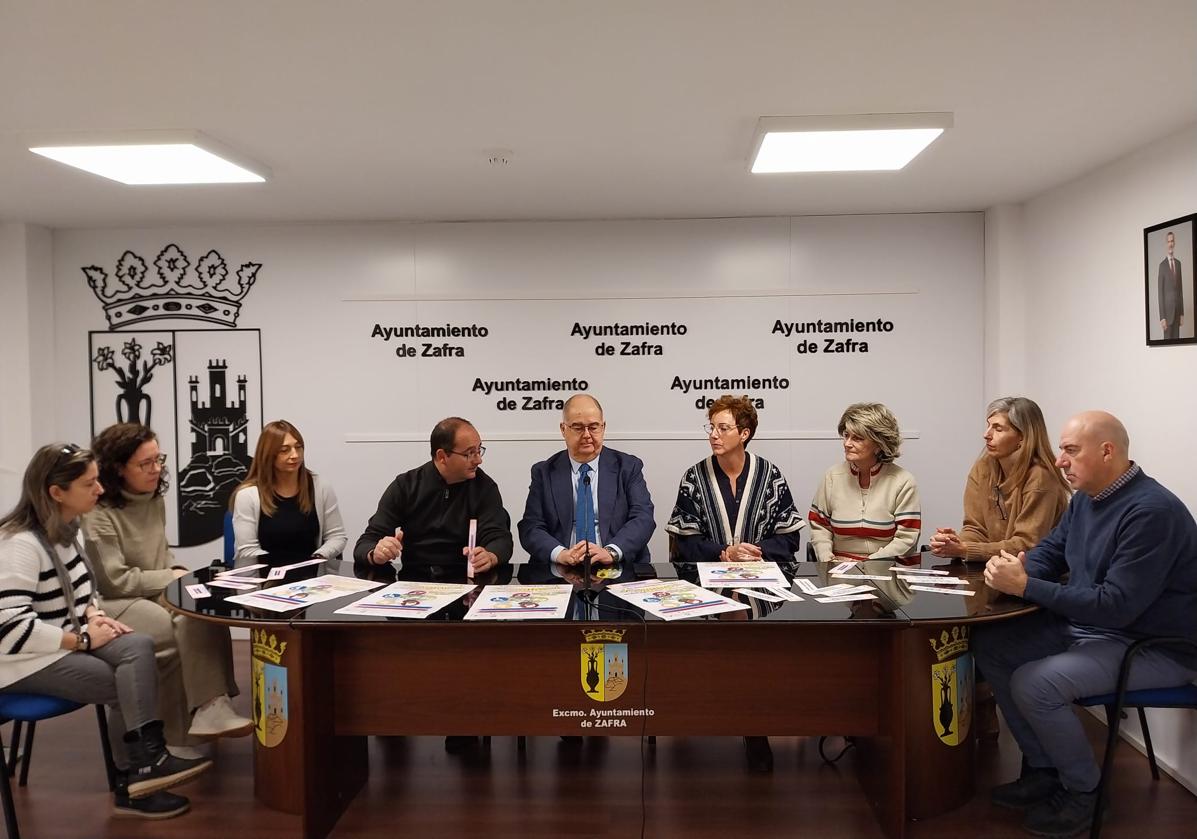 La caminata se ha presentado este martes 26 de noviembre en el ayuntamiento por parte del alcalde, Juan Carlos Fernández, el concejal de Discapacidad y Accesibilidad, Javier Domingo Jaramillo, y las personas responsables de las entidades que trabajan con personas con algún tipo de discapacidad en la ciudad: Patro Matamoros (Aimcoz), Susana Cortés (Hospital de Santiago), Lola Ortega (Plena Inclusión), Susana Carmona (Feafes), Juan Carlos Fuertes (Down Zafra), Maite Casimiro (Aspace) y Mª Eugenia Baena (CEE Antonio Tomillo). En esta iniciativa participan también Apnasurex y Fundación Asmi, aunque no han podido estar presentes en la rueda de prensa. Además de los detalles de la caminata, se han presentado el cartel y unos marcapáginas especialmente diseñados para la ocasión.