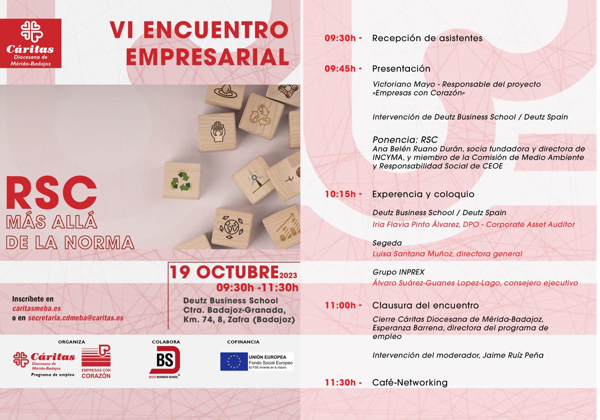 Cáritas Diocesana de Mérida-Badajoz, a través del equipo de Empresas con Corazón y el Programa de Promoción y Empleo, ha organizado para este jueves, 19 de octubre, en Zafra, en la Deutz Business School, el VI Encuentro Empresarial 'RSC, más allá de la norma'.