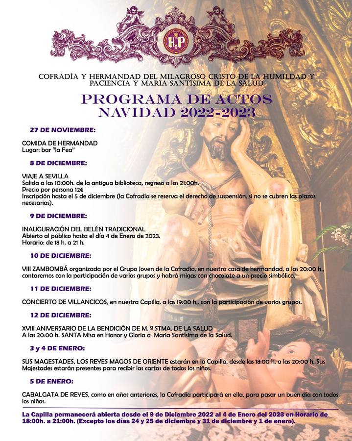 La cofradía del Cristo de la Humildad y Paciencia informa que del 9 de diciembre al 4 de enero su capilla permanecerá abierta de 18 a 21 horas, a excepción de los días 24, 25 y 31 de diciembre y el 1 de enero.