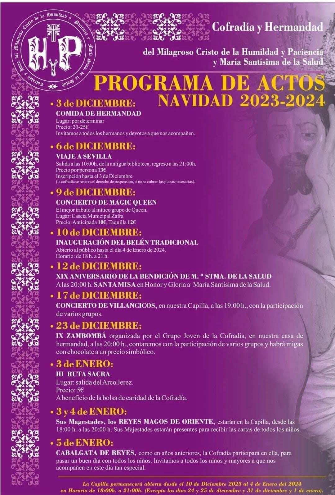 La Cofradía del Cristo de la Humildad y Paciencia y María Santísima de la Salud ha organizado un completo programa de actos de cara a la Navidad 2023-2024.