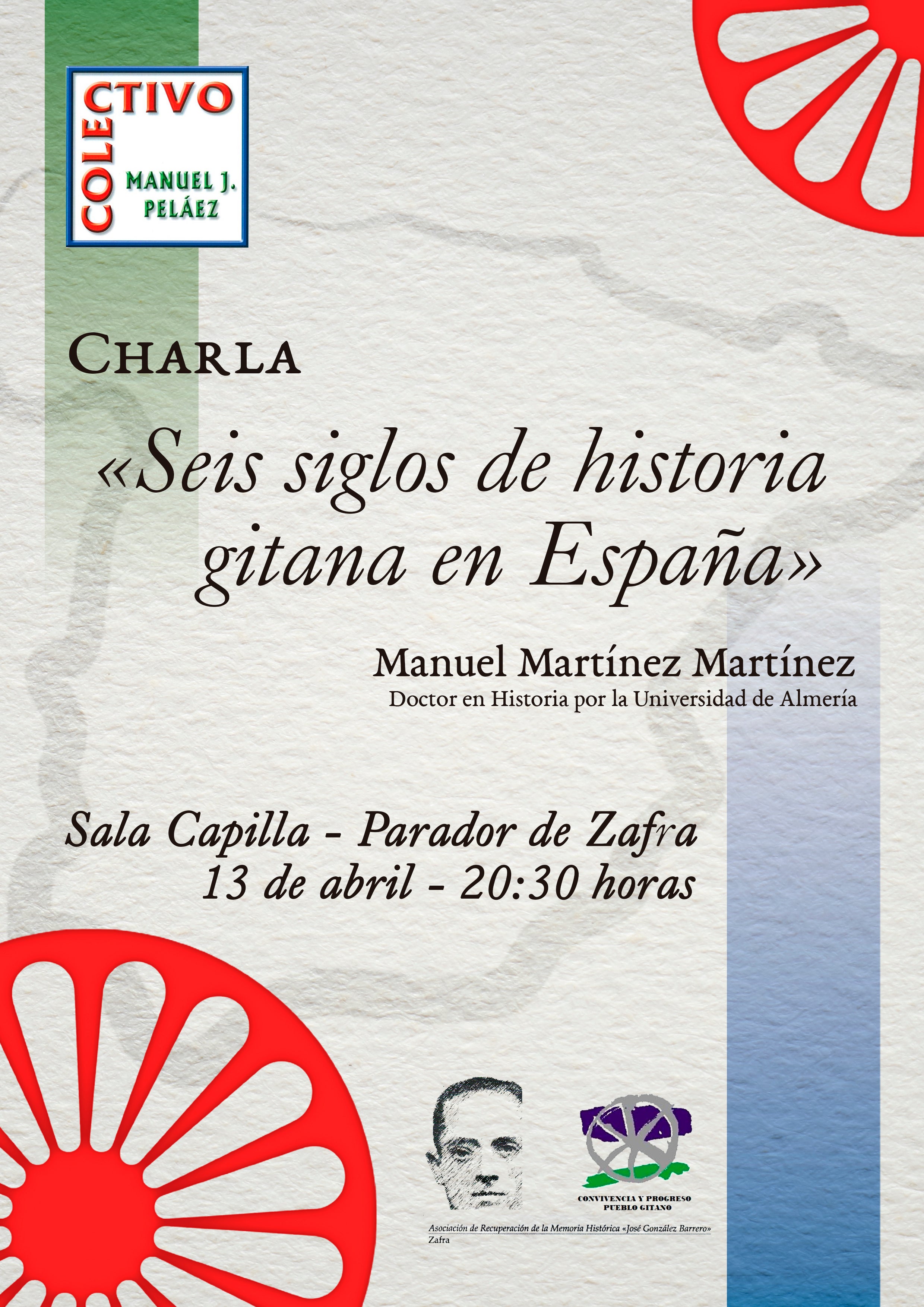El Colectivo Manuel J. Peláez organiza para este jueves 13 de abril, a las 20.30 horas en la Sala Capilla del Parador de Zafra, ... una charla bajo el título 'Seis siglos de historia gitana en España', a cargo de Manuel Martínez Martínez, doctor en Historia por la Universidad de Almería e investigador.