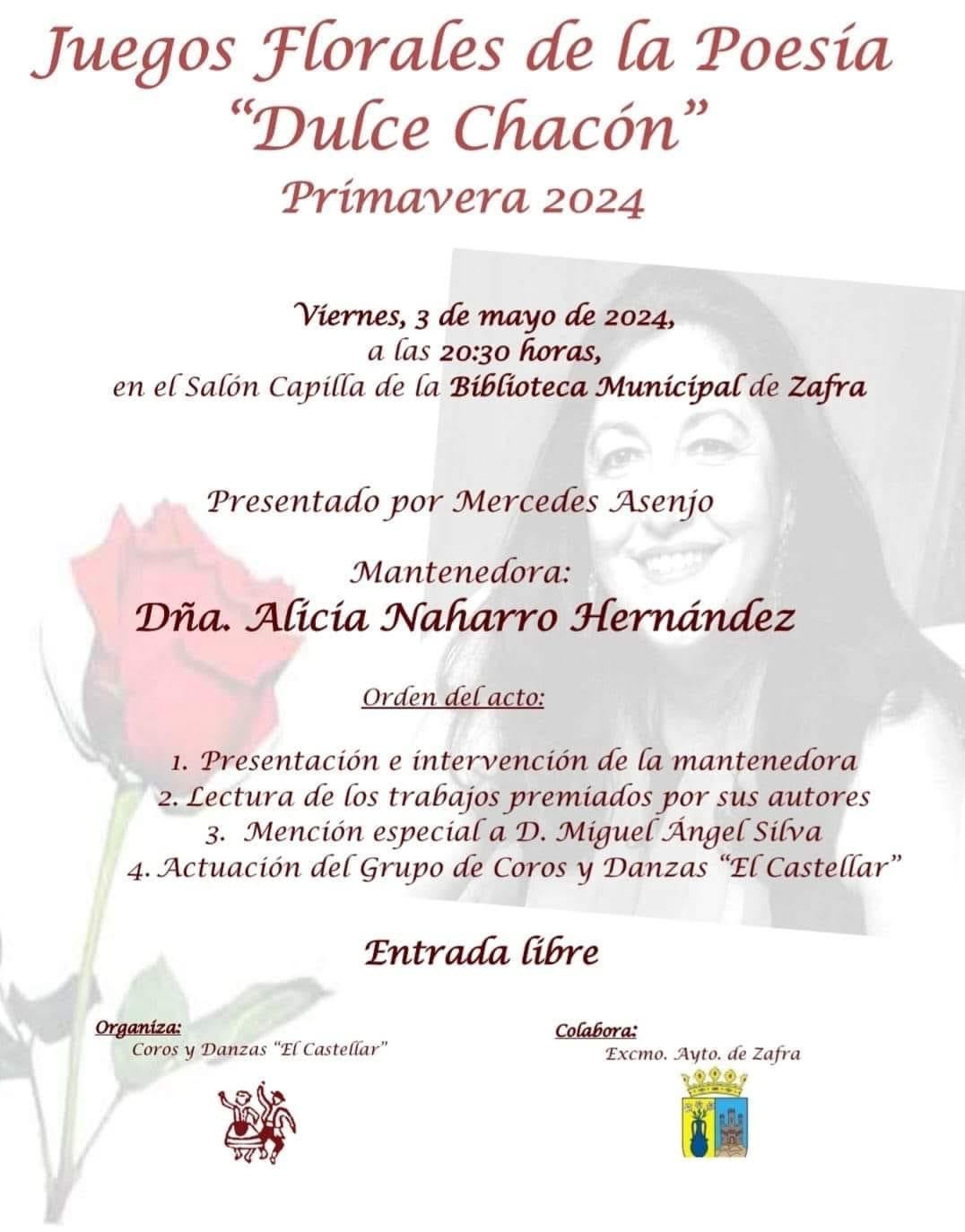 Los Coros y Danzas El Castellar celebran este viernes 3 de mayo una nueva edición, la 21, de los Juegos Florales de la Poesía 'Dulce Chacón'. El acto comenzará a las 20.30 horas en el Salón Capilla Biblioteca Pública Municipal.