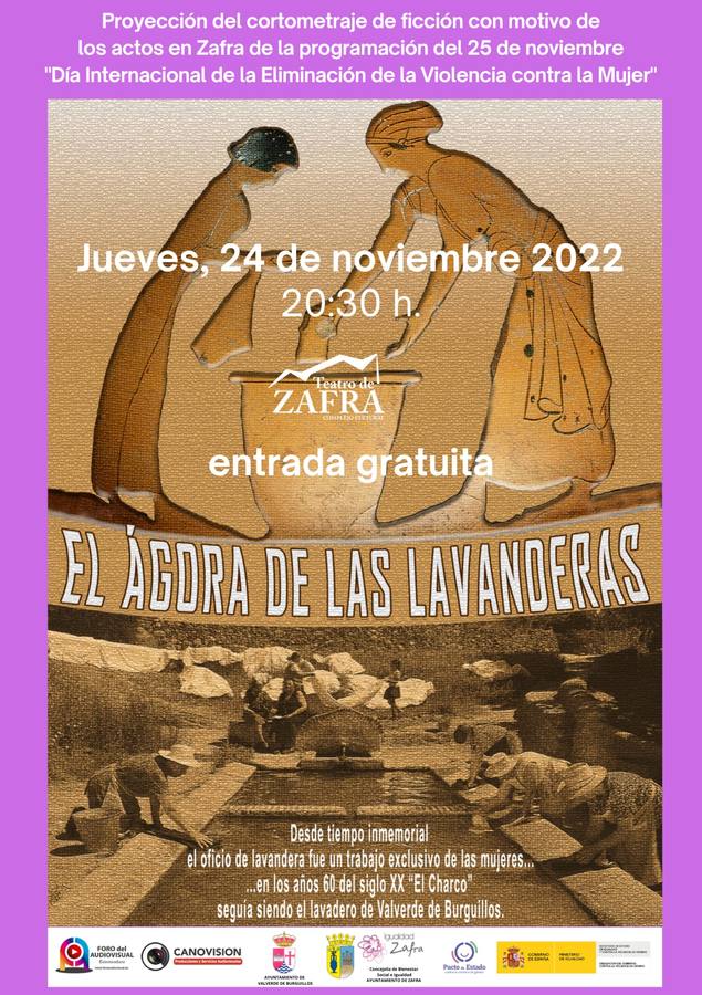 A las 20.30 horas se proyectará en el teatro de Zafra 'El ágora de las lavanderas', un cortometraje de ficción escrito y dirigido por Manuel Gómez, de la productora Canovisión y director de FOREX (Foro del Audiovisual). Es el fruto de un taller de creación cinematográfica interpretado por vecinos y vecinas de Valverde de Burguillos, Zafra y Medina de las Torres.