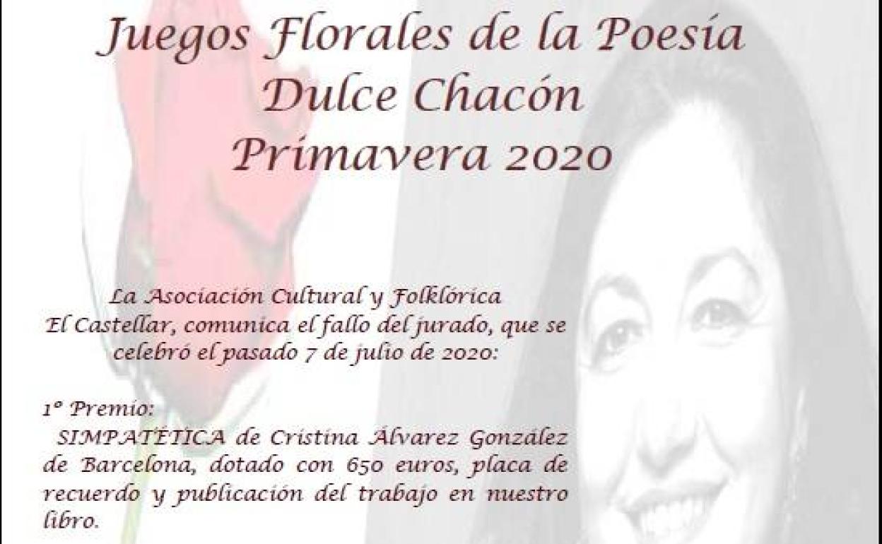 La Asociación Coros y Danzas El Castellar ha hecho público el nombre de los ganadores del su concurso de poesía de los Juegos Florales Dulce Chacón – Primavera 2020. El primer premio, dotado con 650 euros, ha sido para 'Simpatética', de Cristina Álvarez González, de Barcelona. El segundo premio -400 euros- ha recaído en el poema 'El tiempo inacabado', de Jesús Andrés Pico Rebollo, de Sabadell (Barcelona).