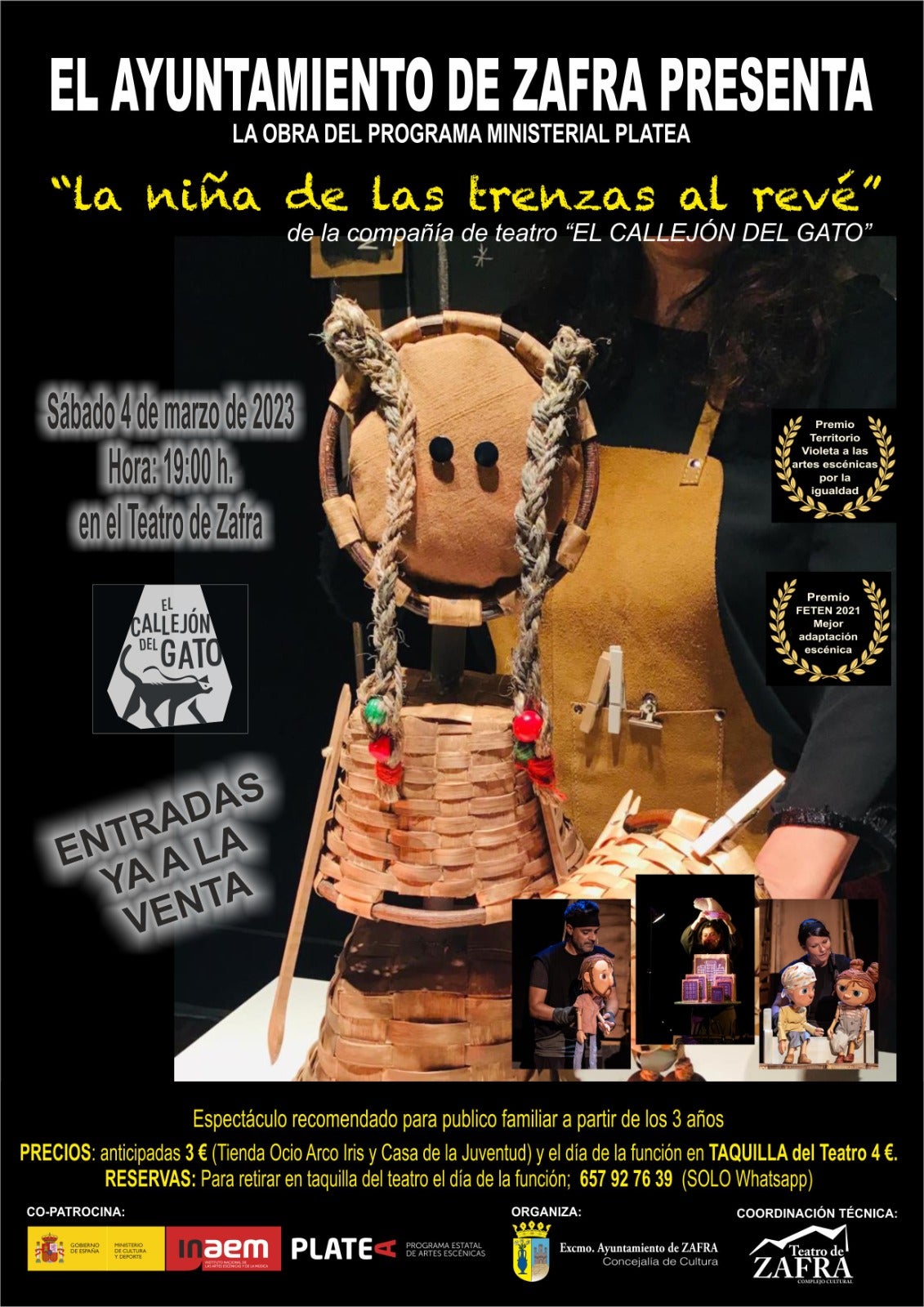 Este sábado 4 de marzo continúa la programación en el Teatro de Zafra a las 19 horas con la obra 'La niña de las trenzas ... del revés', de la compañía El Callejón del Gato, que llega a través del programa Platea del Ministerio de Cultura.