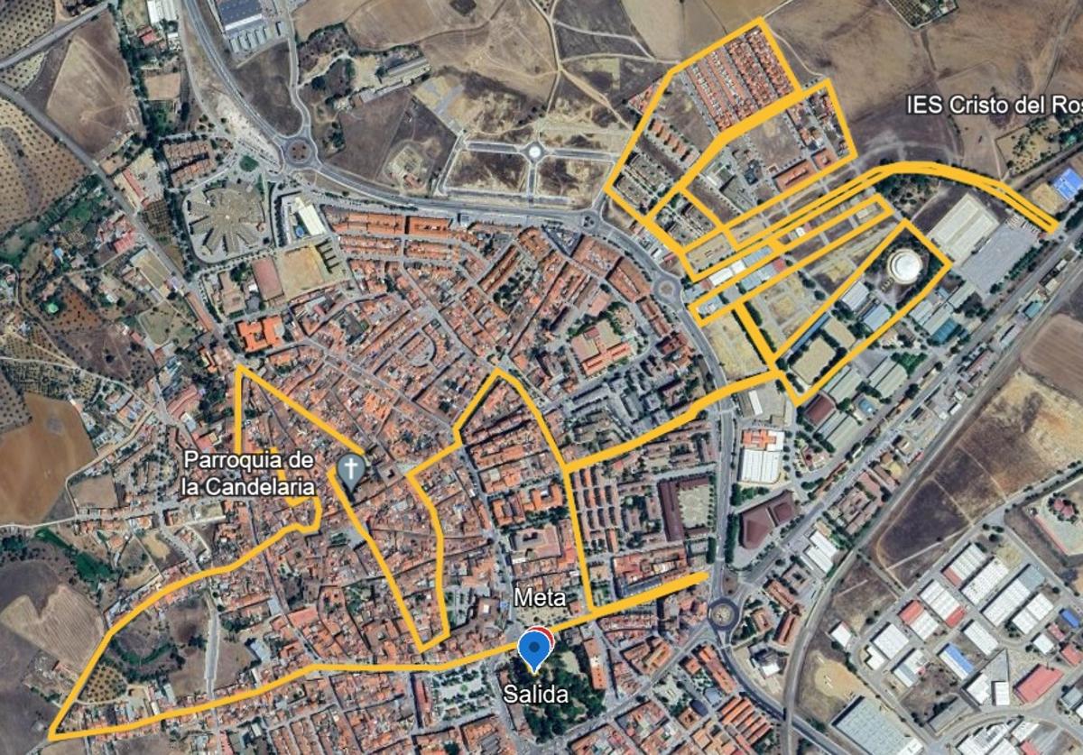 La carrera tendrá como punto de salida y meta el Parque de la Paz, y comenzará su recorrido por las calles, Plaza de España, Campo Marín, Almendro, Garrotera, Jerez (Arco Jerez), Plaza Chica, Boticas, Sor Ángela de la Cruz, Cruz, Diego Bastos, Avenida Campo Rosario, Arco del Cubo, Badajoz, San José, Tetuán, Plaza Grande, Sevilla, Santa Marina, Plaza Corazón de María (Parador de Turismo), Gobernador, Ayuntamiento, Plaza Pilar Redondo, Ancha, Cabezo Bajo, Avenida San Miguel, Avenida de los Príncipes, Barriada de la Constitución (Recinto Ferial), Canarias, Torre de San Francisco, Comunidad Valenciana, Avenida Juan Carlos I, Cantabria, Andalucía, Canarias, Avenida Juan Carlos I, Galicia, Andalucía, Carretera Recinto Ferial, Barriada de la Constitución (Recinto Ferial), Avenida de los Príncipes, Ronda del Pilar, Avenida Antonio Chacón, y Parque de la Paz.