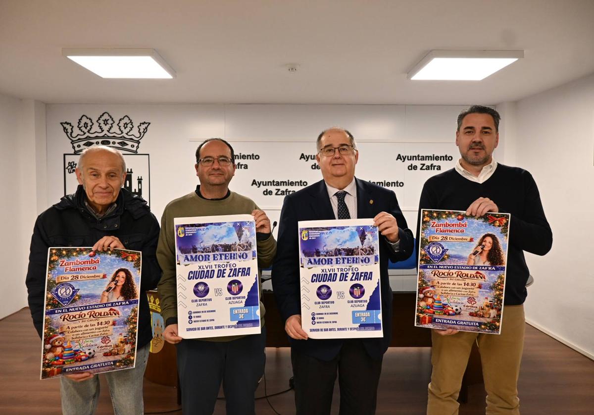 El XLVII Trofeo de Fútbol 'Ciudad de Zafra' se celebrará este domingo 28 de diciembre, a las 12 horas, entre los clubes deportivos de Zafra y Azuaga, en el Nuevo Estadio. La jornada se completará con una Zambomba Flamenca, a cargo de la artista santeña Rocío Roldán y su grupo. Durante la misma se recogerán juguetes y alimentos no perecederos, a beneficio de Zafra Solidaria y Cáritas Zafra. Será a partir de las 14.30 horas y contará con servicio de barra.