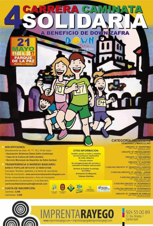 Las inscripciones se pueden hacer en horario de mañana en la Asociación de Down ( Avenida de la Estación 105) y de tarde en la Casa de la Cultura de 17.30 a 19.30 y en La Fundación Municipal de Deportes de 17.00 a 19.00 horas. Por correo electrónico también pueden hacerse las inscripciones en carrerasolidariadownzafra@hotmail.com y en www.asociaciondownzafra.blogspot.com.