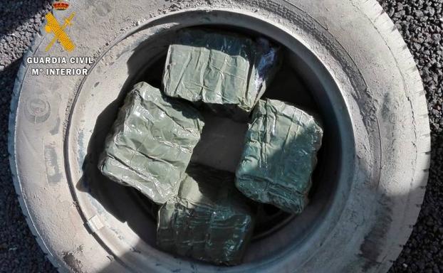 Tras la identificación de las dos personas que viajaban en él e inspección del vehículo, el perro adiestrado marcó a los agentes la supuesta presencia de sustancias estupefacientes en el bajo de la parte trasera del vehículo, por lo que se llevó a cabo un minucioso registro donde se hallaron ocultos en la parte destinada para portar la rueda de repuesto, cuarenta pastillas con un peso total de 4 kilos de hachís de las que se obtendrían en el mercado unas 16.000 dosis de esta droga.