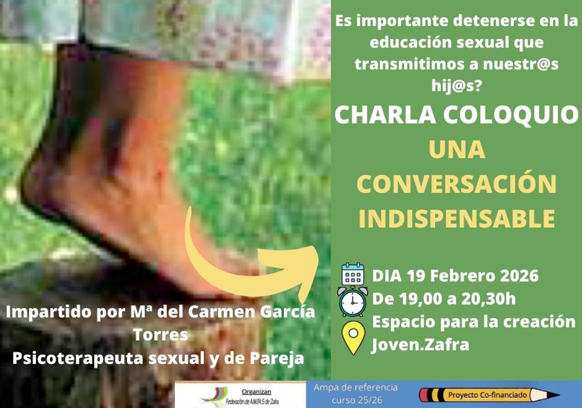 Será impartida por la psicoterapeuta sexual y de pareja Mª del Carmen García Torres y se ha titulado 'Una conversación indispensable'. durante la charla se analizará la importancia de detenerse en la educación sexual que se trasmite a los hijos e hijas.