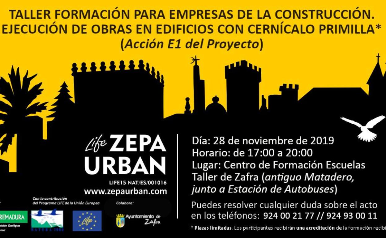 Para asistir es necesario inscribirse a través de correo electrónico lifezepaurban@juntaex.es o llamando al teléfono 924 00 21 77Zafra acogerá este jueves 28 de noviembre el ‘Taller para empresas de la construcción que ejecutan obras en edificios con presencia de cernícalo Primilla’, enmarcado en la Acción E1 del Proyecto LIFE ZEPAURBAN. Será en el Centro de Formación de Escuelas Taller de Zafra (antiguo matadero) de 17.00 a 20.00 horas y las plazas son limitadas. Se cuenta con la colaboración del Ayuntamiento de Zafra.