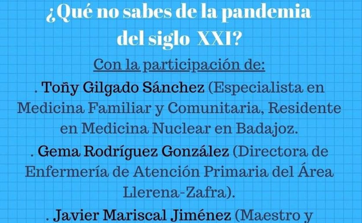 Toñy Gilgado, Gema Rodríguez y Javier Mariscal Jiménez analizarán esta cuestión desde el punto de vista médico, de la salud comunitaria y del protocolo educativoLa Escuela de Familias de la Federación de AMPAS de Zafra ha organizado para hoy sábado una nueva sesión, una mesa informativa online sobre la ... Covid-19: '¿Qué no sabes de la pandemia del siglo XXI?'.