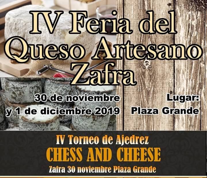 Se celebrará los días 30 de noviembre y 1 de diciembre en la Plaza de España y se completa con el IV torneo de Ajedrez Chees and CheeseLa cuarta edición de la Feria del Queso Artesano de Zafra se celebrará los días 30 de noviembre y 1 de diciembre en la Plaza ... Grande, con la participación de 15 queserías de toda España. Un evento que se completa cada año con el torneo de ajedrez 'Chees and Cheese', que también celebra su cuarta edición.