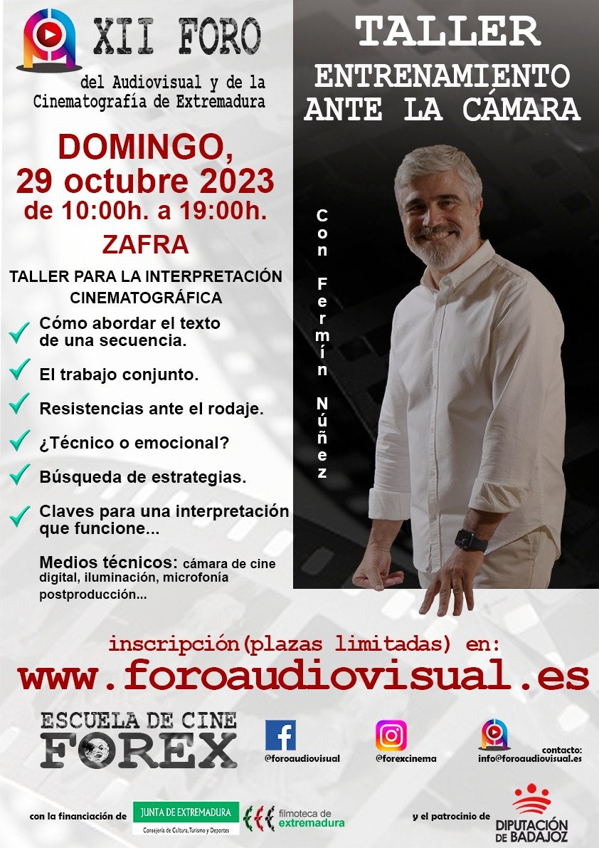 El Foro del Audiovisual de Extremadura continúa con su apuesta por la formación en interpretación para cine y televisión. En este sentido, el próximo domingo 29 de octubre de 10 a 19 horas, ofrecerá un nuevo taller bajo el título 'Entrenamiento ante la cámara', a cargo de Fermín Núñez, un veterano actor extremeño con una larga trayectoria en teatro, cine y televisión.