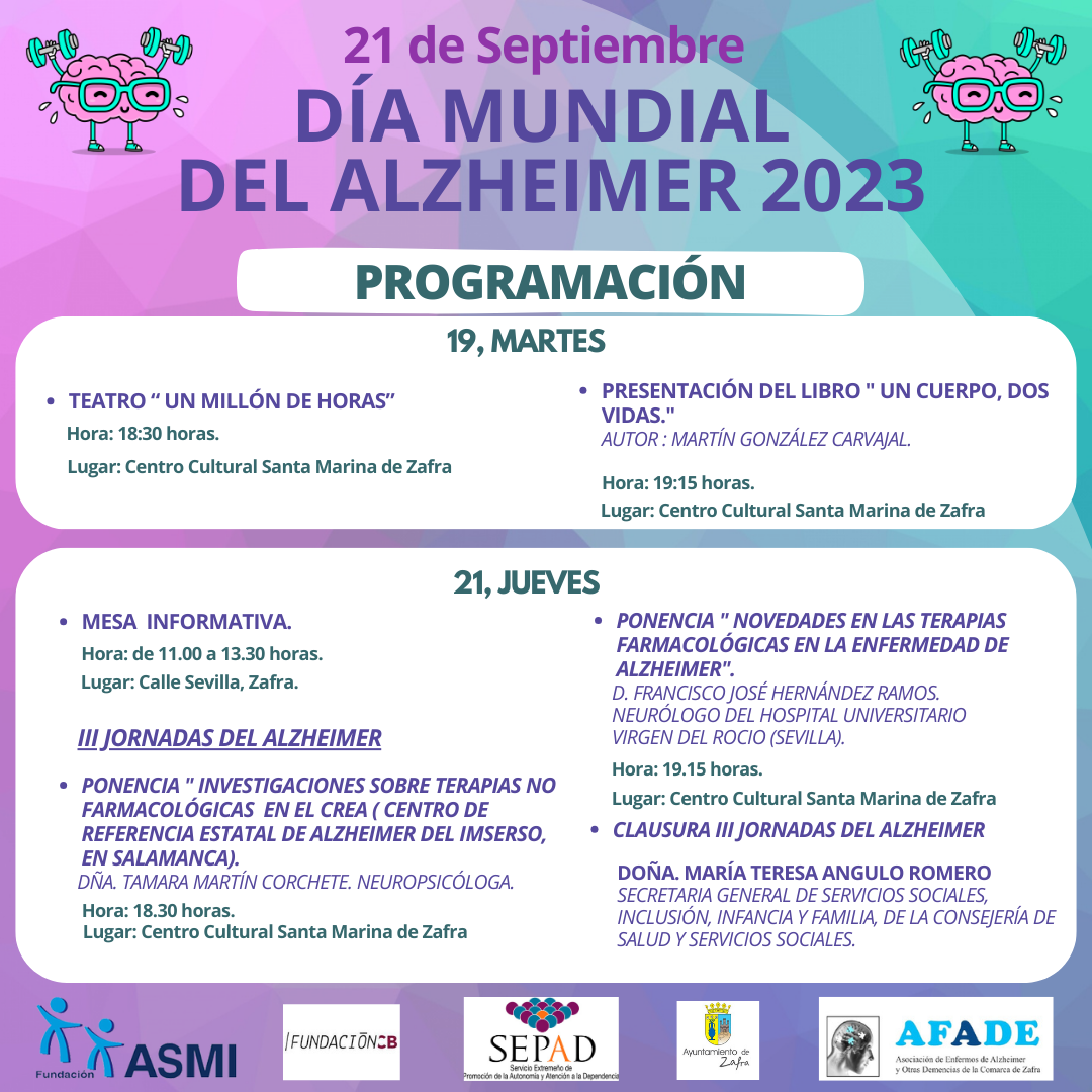 Fundación Asmi y Afade (Asociación de Enfermos de Alzheimer y Otras Demencias de la Comarca de Zafra) se unen un año más para conmemorar el Día Mundial del Alzheimer, que se conmemora cada 21 de septiembre. Para ello han organizado una serie de actividades los días 19 y 21 de septiembre en el Centro Cultural de Santa Marina, a partir de las 18.30 horas.