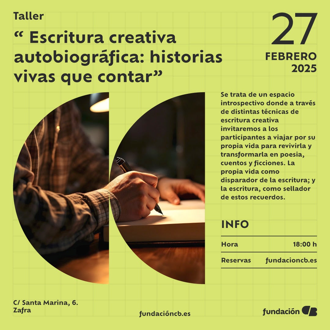 El próximo jueves 27 de febrero, a las 18 horas, Fundación CB celebrará un taller de escritura creativa autobiográfica para adultos en su sede en Zafra, el Centro Cultural Santa Marina.