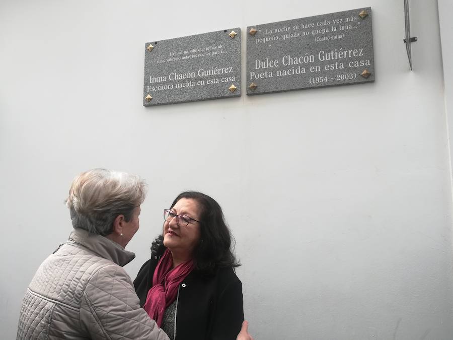 Tras presentar a la autora ambos se fundieron en un cálido abrazo. Visiblemente emocionada la autora Inma Chacón pidió que sus hijas la acompañaran a la hora de desvelar la placa que sigue el mismo estilo y estética que la de su hermana.