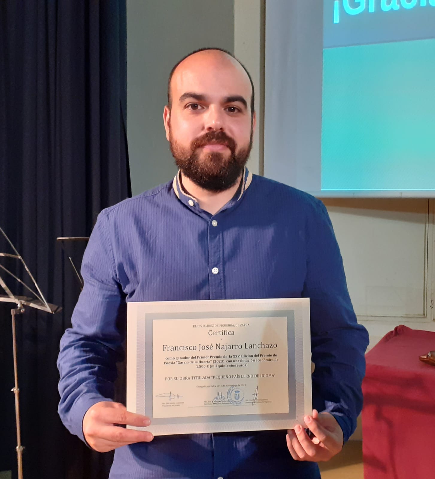 El escritor y editor zafrense, Francisco José Najarro Lanchazo (o Paco Najarro tal y como aparece publicado), se ha convertido en el ganador de la XXV edición del Premio de Poesía García de la Huerta 2023 por su poemario, 'Pequeño país lleno de idioma', en el certamen que convoca cada año el Instituto Suárez de Figueroa de la ciudad. El premio está dotado con 1.500 euros y ha sido publicado en los «Cuadernillos Intramuros».