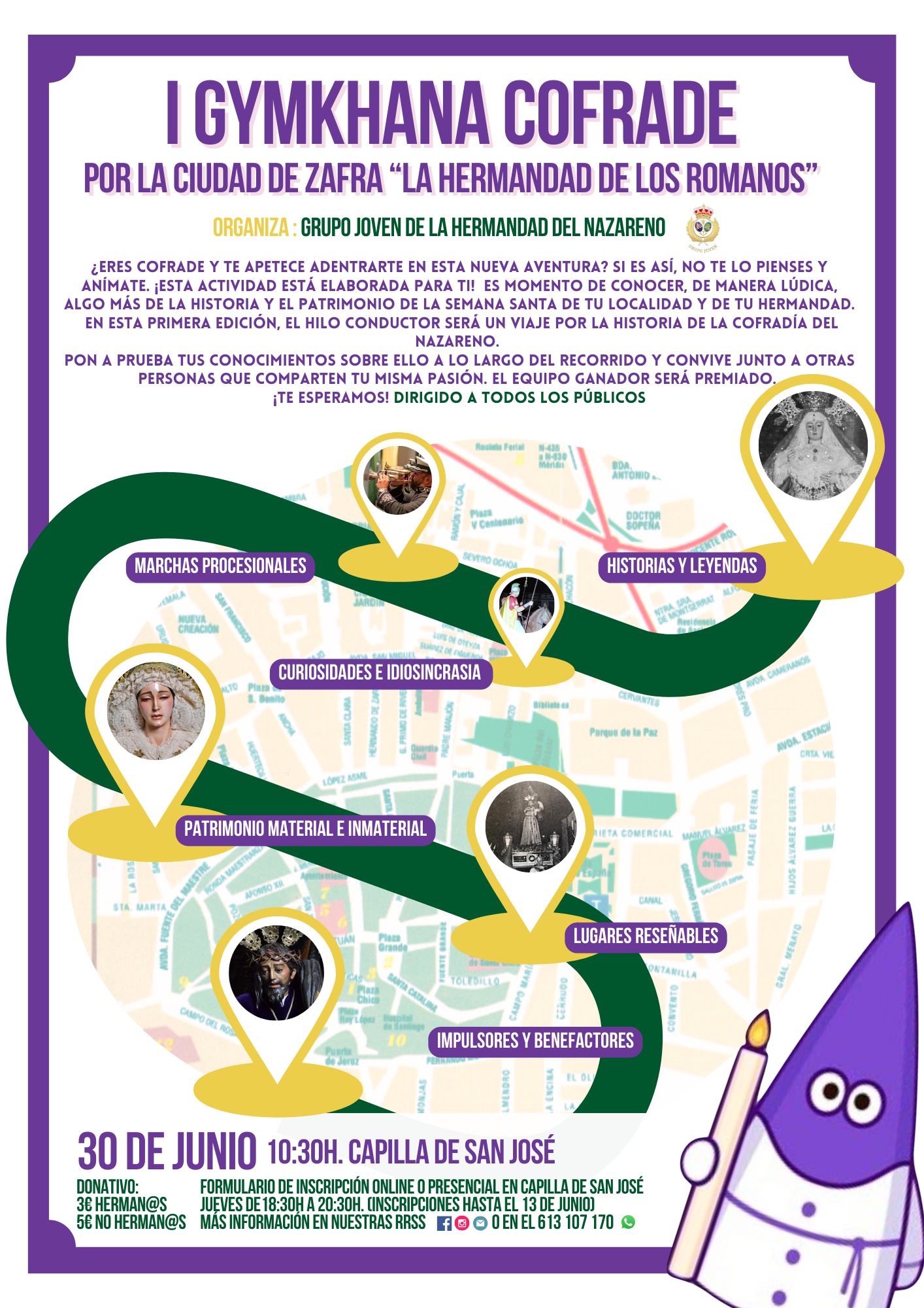 Se trata de una original actividad que permitirá a los participantes conocer de manera lúdica la historia, fe y el patrimonio de la Semana Santa zafrense, así como de las distintas hermandades. En esta primera edición, «el hilo conductor será un viaje por la historia de la cofradía del Nazareno, conocida popularmente como la de los romanos», ha señalado Miguel Ángel Ortiz, diputado de Juventud de la cofradía.