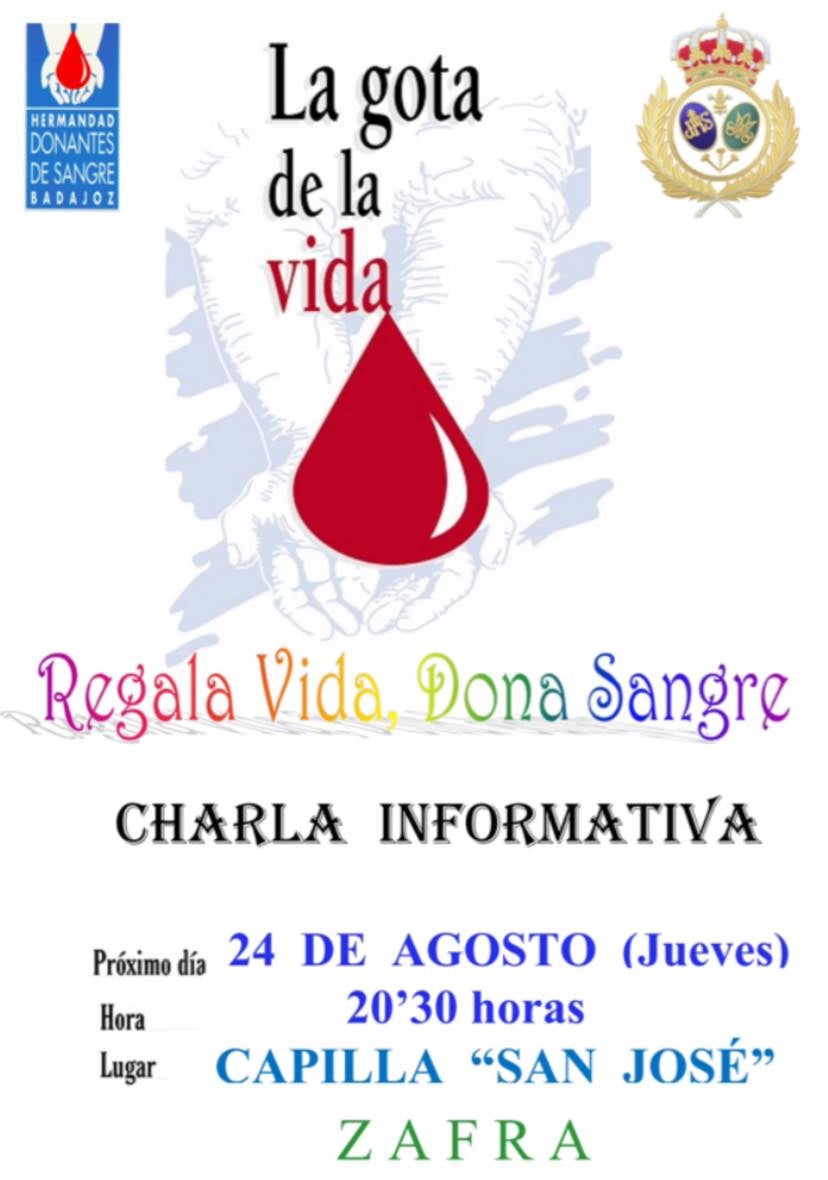 La Hermandad y Cofradía de Nuestro Padre Jesús Nazareno y María Santísima de la Esperanza de Zafra, junto a la Hermandad de Donantes de Sangre de Badajoz, han organizado para el próximo 24 de agosto a las 20.30 horas en la Capilla de San José, una charla informativa y de sensibilización para la ciudadanía y, especialmente, para a los más jóvenes sobre la importancia que tiene donar sangre, plasma y médula.