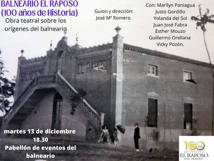 Un grupo de actores de Zafra y la comarca, dirigidos por José Mª Romero, representará el martes, 13 de diciembre, una obra teatral sobre la ... historia del Balneario El Raposo con motivo de la conmemoración de su centenario. Dará comienzo a las 18.30 horas en el pabellón de eventos del balneario.