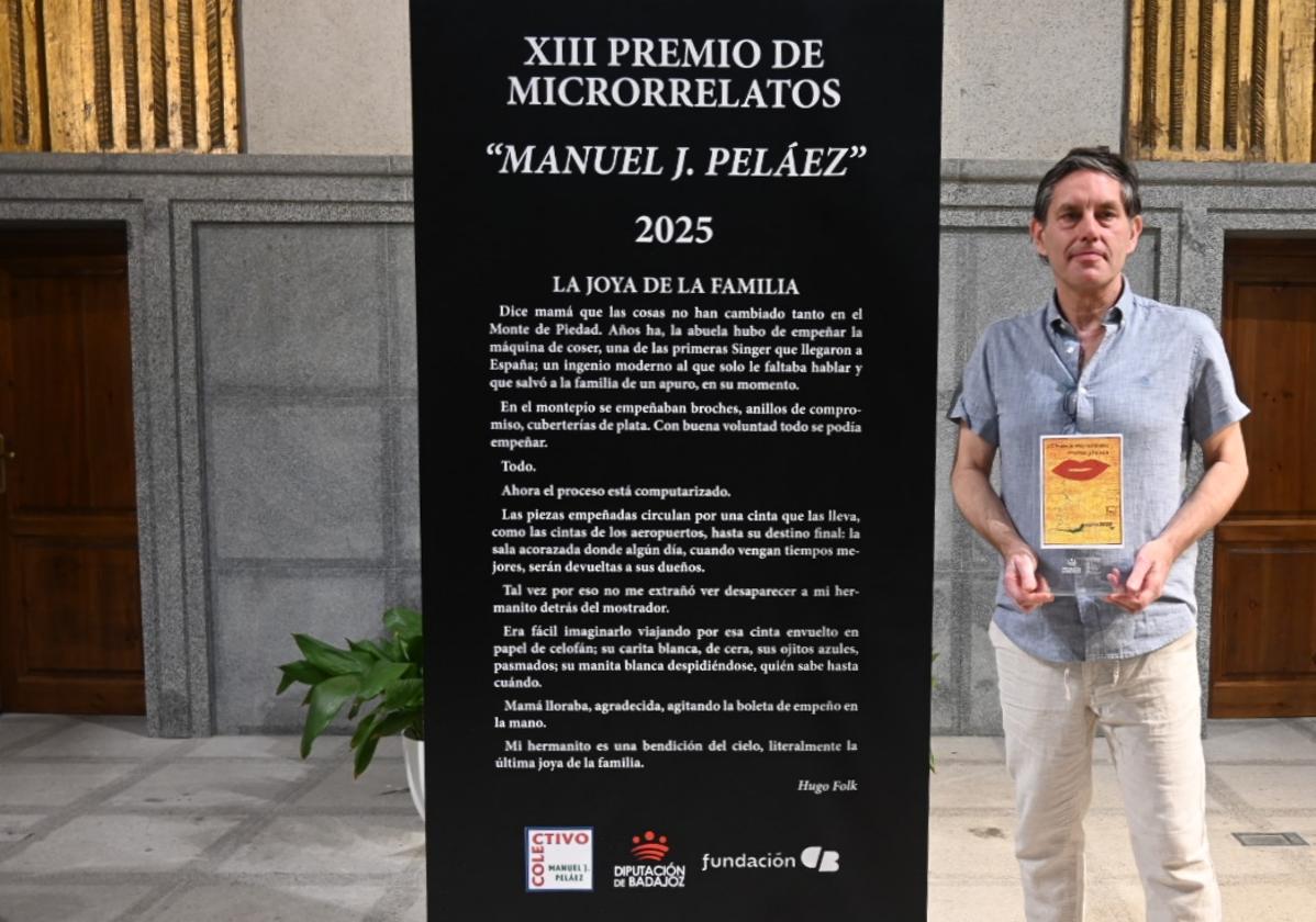 Hugo Folk recibió muy contento el premio de la mano de la presidenta del colectivo, Eva Arenales. En su discurso resaltó la importancia de la palabra y el esfuerzo que realizan los escritores con ella: «Si me dedico a escribir es precisamente porque elogio esa palabra. Siempre agradezco las palabras que impulsan cualquier tipo de lectura», dijo. En 2021 empezó a escribir y a ganar premios, lo que le animó a seguir haciéndolo: «Los premios son el mejor fomentador de lectura», subrayó. Tras agradecer al colectivo y destacar la calidad de los textos participantes, leyó su microrrelato, de 186 palabras, 'La joya de la familia'. El texto, con inverosimilitud y fina ironía, está basado en un recuerdo de su infancia a la edad de cinco años, cuando acompañó a su madre a las oficinas de Monte de Piedad, una casa de empeños situada en el centro de Barcelona. «Allí se empeñaba todo, cualquier cosa. El cuento va de que se empeñaba cualquier cosa, es decir, hasta podíamos empeñar lo último que nos quedaba en la familia. Me imaginé a un niño colocado en la línea transportadora y perdiéndose en las entrañas de esa especie de gran banco. Literalmente lo hemos empeñado todo y lo último que nos queda por empeñar es la última joya de la familia: mi hermanito», contó. Al finalizar el acto, firmó algunos ejemplares.