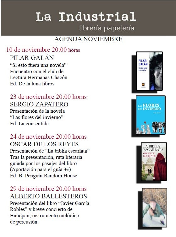 La librería La Industrial informa de las distintas actividades que ha programado para este mes de noviembre. Todas las actividades darán comienzo a las 20 horas.