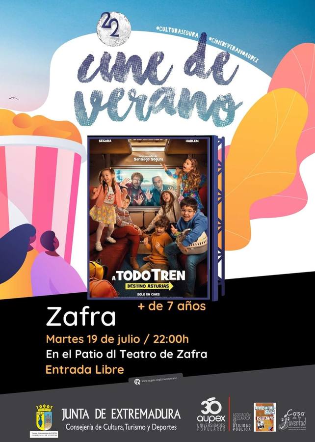 Hoy martes 12 de julio continúa el 'Circuito Cine de Verano' con la proyección de una divertida comedia familiar dirigida por Santiago Segura: '¡A todo ... tren! Destino Asturias'. Dará comienzo a las 22.00 horas en el patio del Teatro de Zafra, al aire libre, y la entrada es libre. No está recomendada para menores de 7 años.