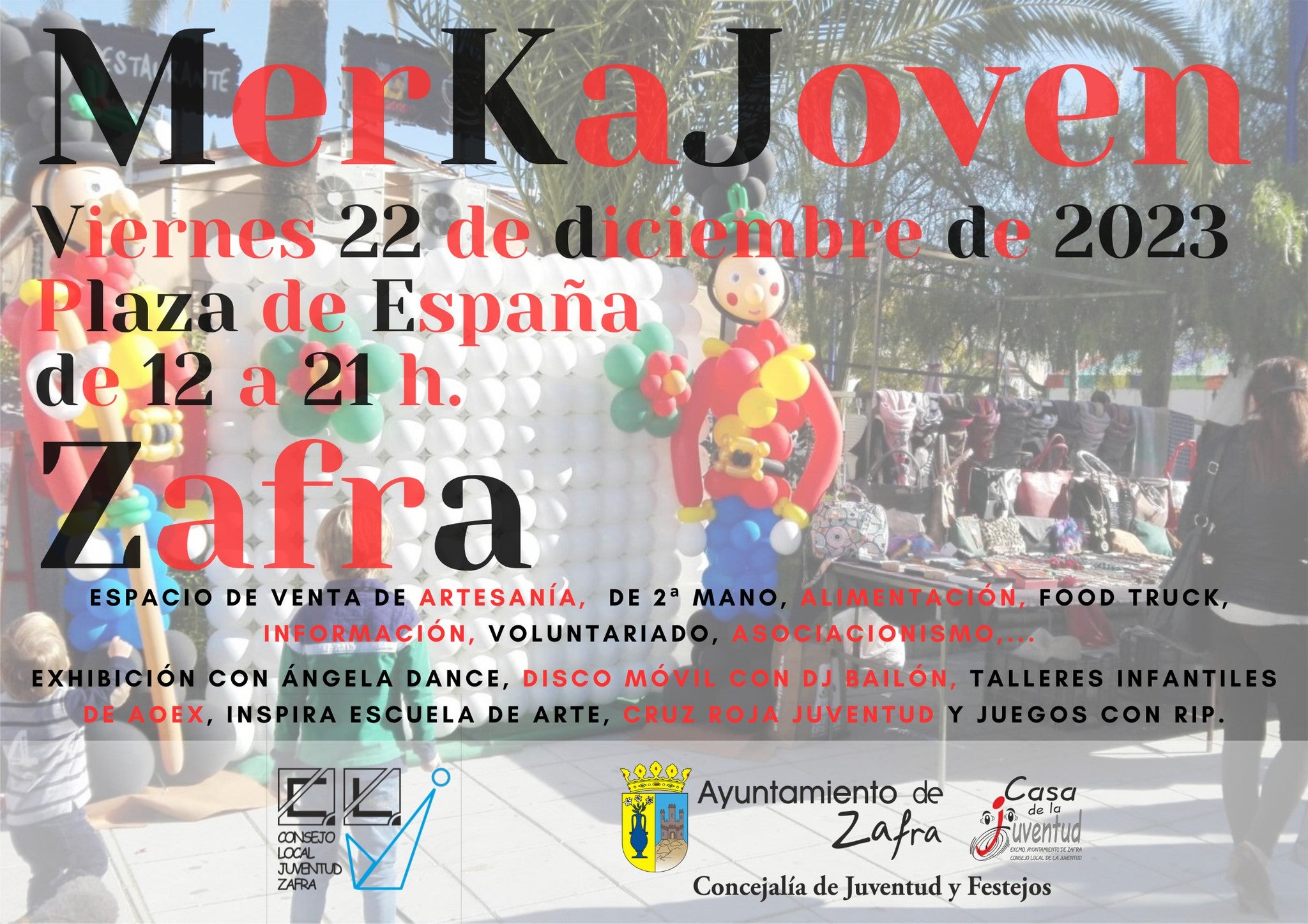 El Merkajoven 2023 se celebrará este viernes 22 de diciembre en la Plaza de España desde las 12 hasta las 21 horas. En esta edición participan 25 artesanos y vendedores que ofrecerán en sus puestos los artículos y productos más variados, y 14 asociaciones y colectivos que colaboran o aprovechan este evento para mostrar su actividad.