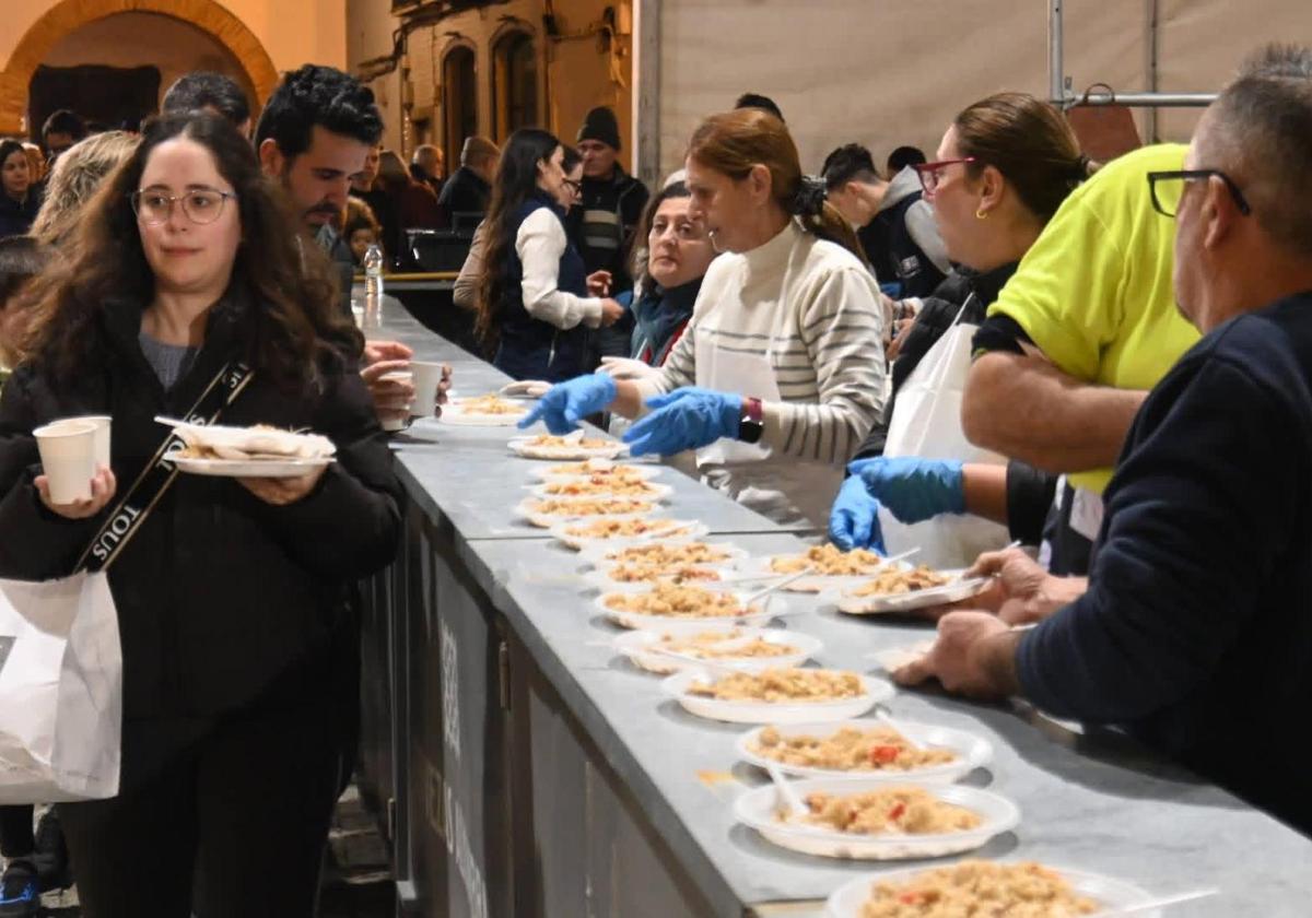 La gran multitud de ciudadanos de todas las edades que esperaron su turno, comenzaron a degustar las migas con chocolate a partir de las 20.30 horas, cuando comenzó el reparto.