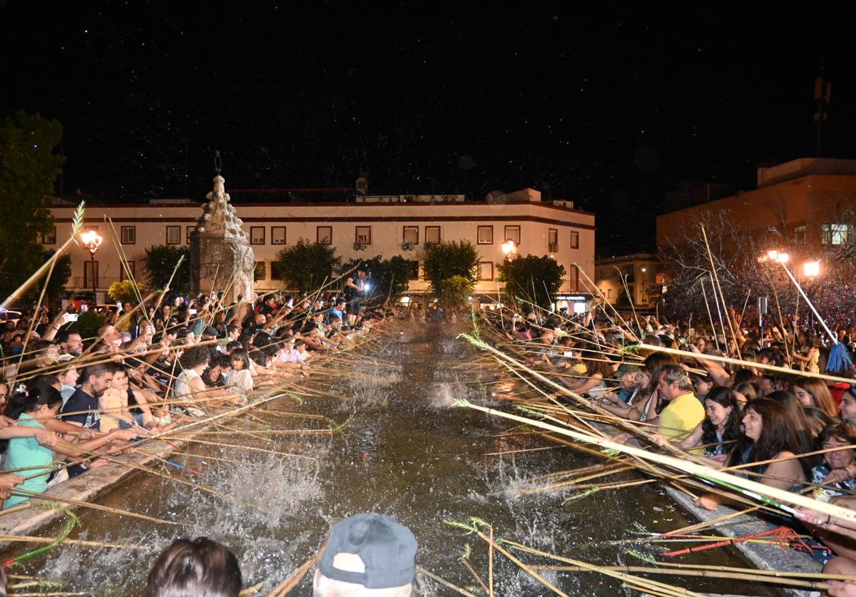 A las 00.00 horas llegó el momento más esperado de la noche: la 'Mojá de la Vara'. Multitud de personas mojaron sus varas y otros objetos en el agua del pilar del Duque, en un acto de purificación del cuerpo y de atraer la suerte, la fortuna o el trabajo. Algunos incluso se bañaron en el pilar. Mientras el cielo se iluminó con el espectáculo de fuegos artificiales y Dj Gipsy Power 69 cerró la noche con su música.