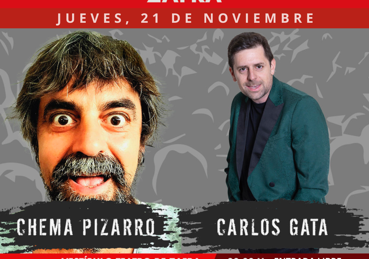 El espectáculo en Zafra correrá a cargo de Chema Pizarro y Carlos Gata, que ofrecerán en el vestíbulo del teatro su particular espectáculo de monólogos y humor. La entrada es libre.
