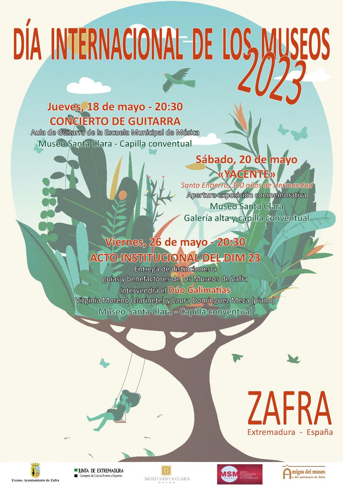 El acto institucional del DIM se celebrará el viernes 26 de mayo, a las 20.30 horas en la Capilla de la Iglesia Conventual de Santa Clara organizado por los museos de Zafra, el de Santa Clara y el de la Medicina. Durante el acto también se entregarán las distinciones a los guías y benefactores de dichos museos.