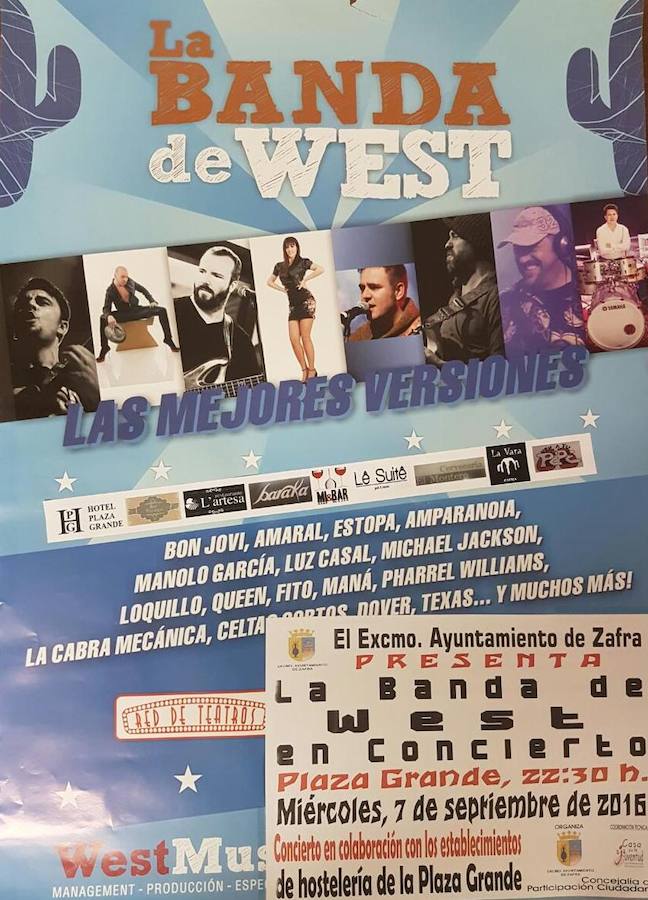 La Banda de West es una formación musical de versiones extremeña. En su repertorio grandes éxitos de ámbito Nacional e Internacional: Bon Jovi, Amaral, Celtas Cortos, Dover, El Último de la Fila, La Cabra Mecánica, Loquillo, Bebe, MClan, Luz Casal, Platero y Tú, Pharrel Williams, Queen, Texas, Mecano o Cher entre otros.