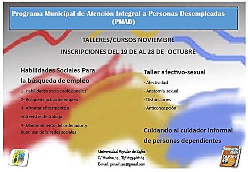 El Programa Municipal de Atención Integral a Personas Desempleadas que se realiza en la Universidad Popular de Zafra ha abierto el plazo de matriculación para los cursos y talleres de su programación de noviembre.
