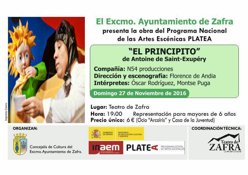 Es precisamente la obra teatral adaptada de este texto la que se podrá disfrutar el próximo 27 de noviembre en el complejo cultural Teatro de Zafra a partir de las 19.00h. Se trata de una obra pensada para el público familiar y que estará interpretada por los miembros de la compañía N54 Producciones, que inicia su trayecto en 2008 con la gestión del SAT! Teatro de Barcelona, equipamiento de la ciudad de programación familiar estable. El principito se ha convertido en el libro en francés más leído y más traducido. También en una de las obras más vendidas de todos los tiempos.