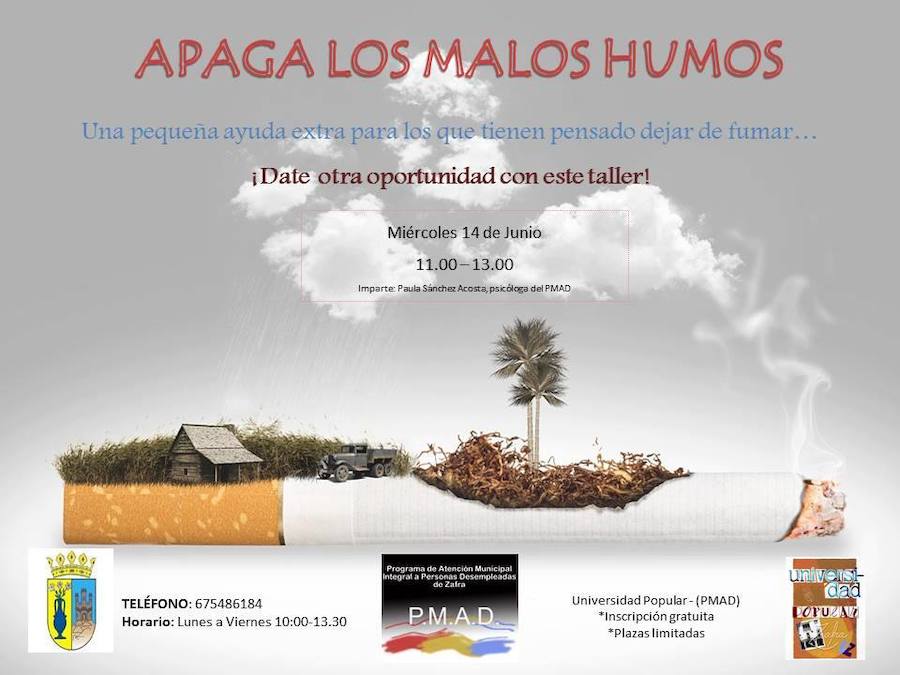 Se trata de un taller de una jornada llamado 'Apaga los malos humos' y que se dirige a todas aquellas personas que buscan dejar de fumar.