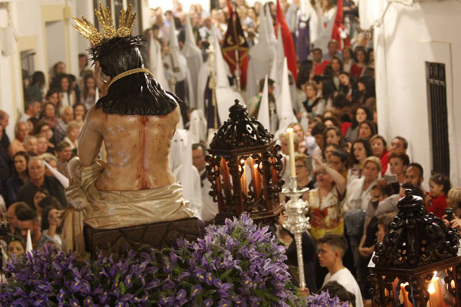 El Cristo regresa a su capilla en el Arco Jerez y la Virgen sigue su recorrido hasta la parroquia por las calles Agua, Santa Ángela de la Cruz, Tetuán y Conde de la Corte.